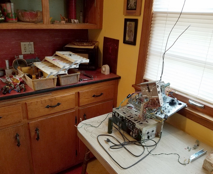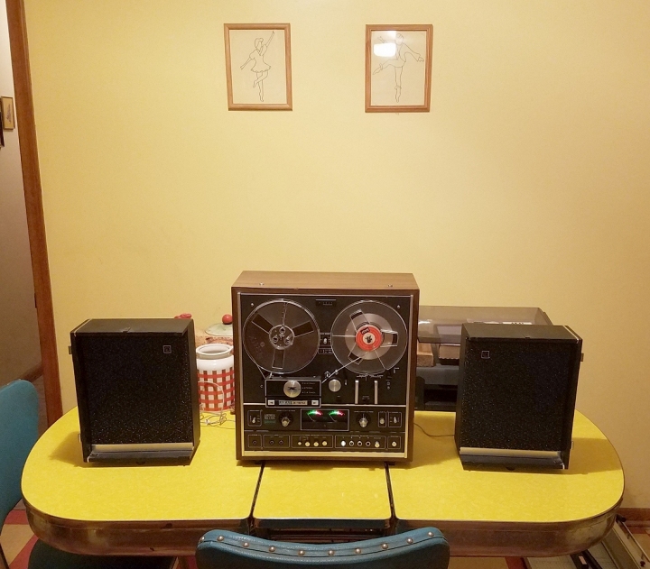 Back to: deep archives For those of us who think the world changes too fast ---------------------------------------------------- Restoring reel-to-reel tape decks February 12, 2024 Roger Luebeck A few days ago I picked up four not-working reel-to-reel tape decks for mere pennies, and have already got three restored to excellent working order. One needed capacitors and restoration of cams. Another needed cleaning of audio-pots, heads and speaker-switch. A third one needed mechanical repairs along with cleaning of pots and head. Haven't tore into the fourth one yet. Reel-to-reel tape decks are something I drooled over as a young guy and never thought I could actually afford. The key is to find cheap ones that are in need of repair and do one's own work on them. There are only a half-dozen small outfits on the entire planet that are manufacturing new reel-to-reels these days. The prices range from 14,000 to 40,000 dollars. I invested 605 dollars for four of them (50, 50, 125, 280), and have already turned three of them into excellent machines with beautiful sound quality. One more to go. (Two more to go. I still haven't put back together the one that needed the capacitors and cams.) Make your day by playing the two-minute video below with audio activated. Red Roses for a Blue Lady. Three photographs are below the video box. Picture one -- Akai on table with dancers on wall: