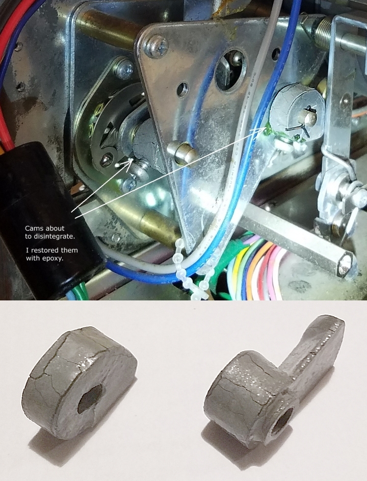 Picture three -- close-up of bad cams. Disintegrated cams is the number one reason people abandon their Akai reel-to-reels. My solution was to brush thin epoxy glue into the cam cracks. They will last forever: