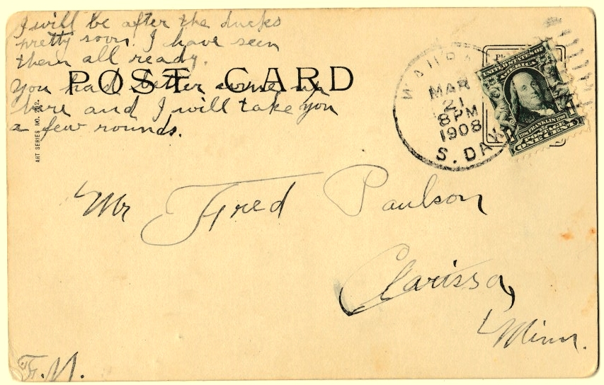 <-- back to index I will be after the ducks pretty soon. I have seen them all ready. You had better come up here and I will take you a few rounds. F.M. <-- back to index